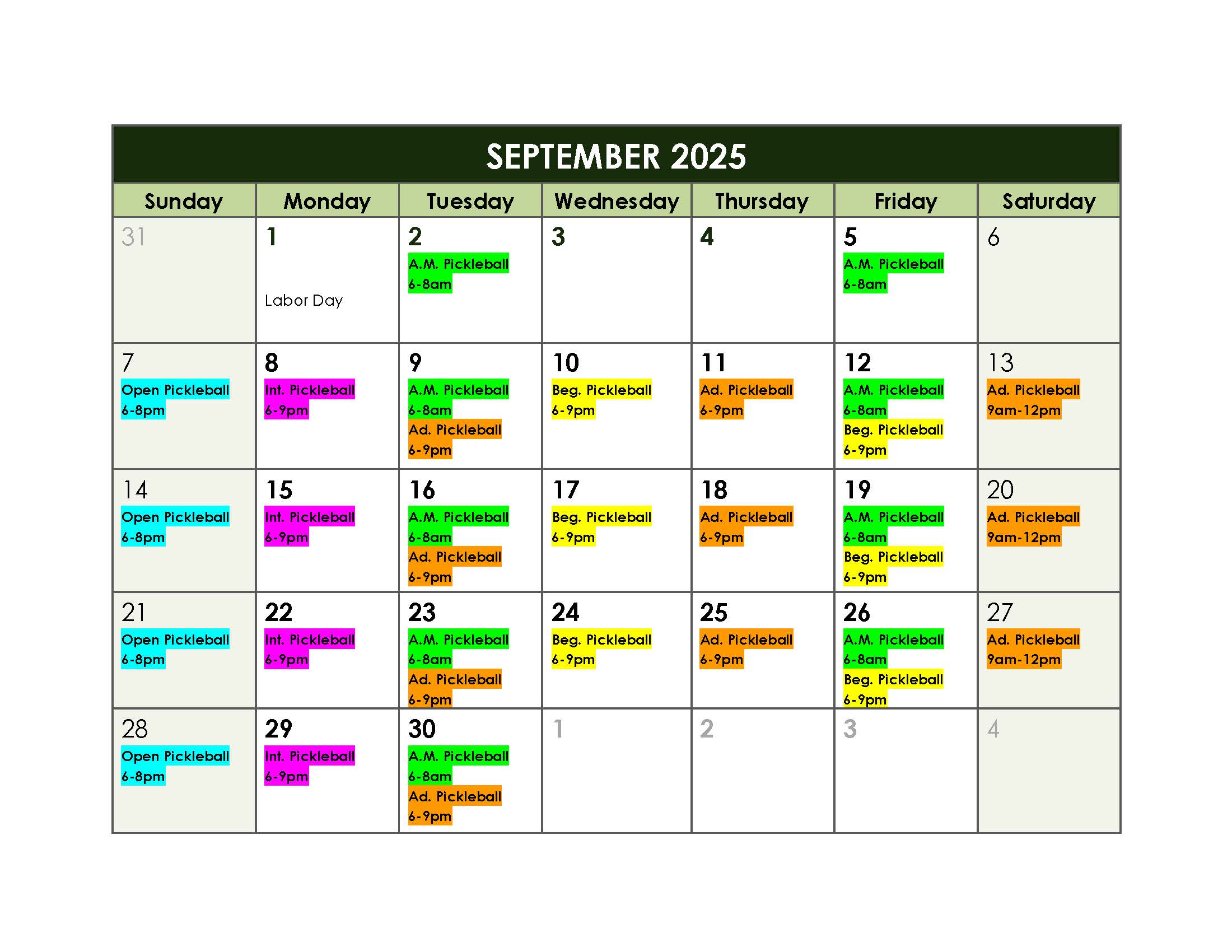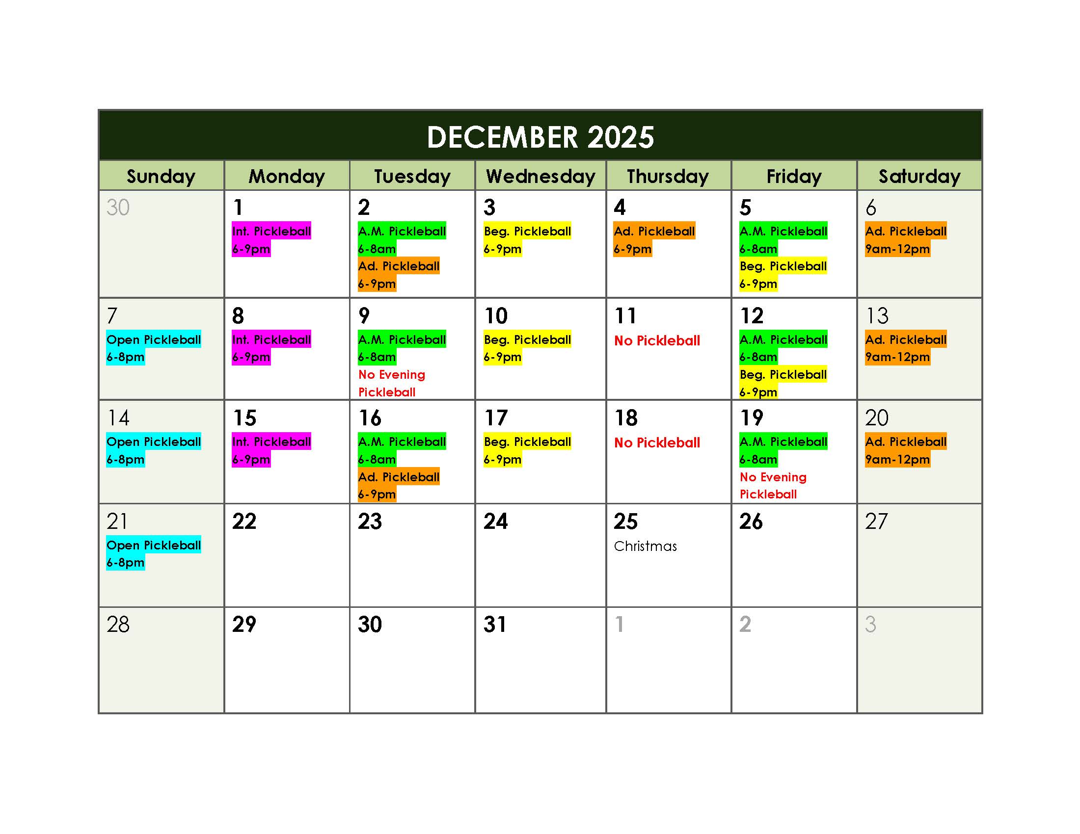 Schedule updates as of 8/8/2025: No pickleball on MEA weekend 10/16-10/19 (floors refinished), 12/9, 12/11, 12/18 & 12/19